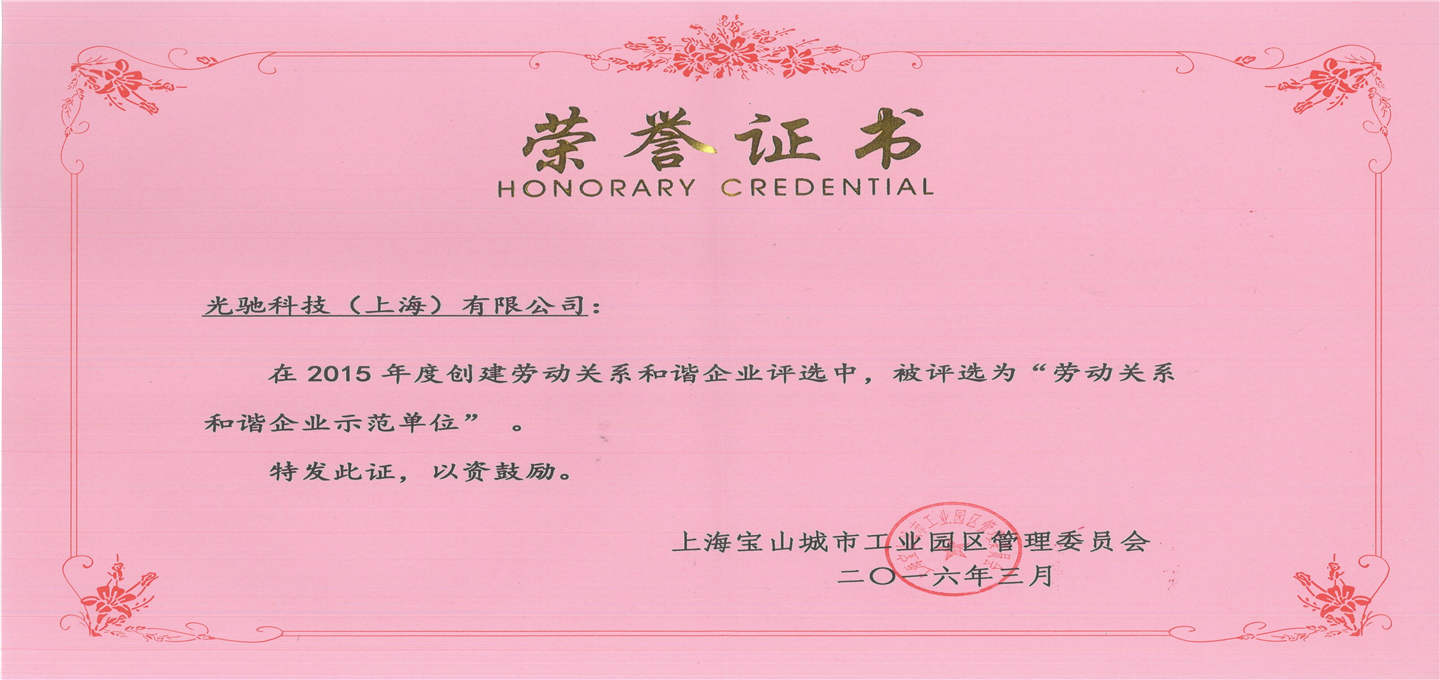 荣获”2015年度宝山城市工业园区劳动关系和谐企业“